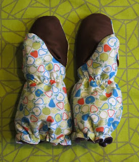Rukkasten päälliskangas on Eurokankaasta ostettu PUL (kämmenpuolen ruskea PUL tilattu jostain nettiputiikista joskus). Sisäpuolella on tummanlila fleece ja välissälämpövanua. Kämmenpuon päädyin ompelemaan tummemmasta PUL:sta jotta lika ei siinä näkyisi niin hyvin. Oikein lämpimänoloiset noista tuli ja esikoinen tykkäsi. Mitäpä muutakaan äiti olisi voinu viime yönä tehdä kuin ommella. Vaikka aluksi oli harsia vain vanu vuorikankaisiin kiinni... mutta kun ei malttanut lopettaa! Lopulta rukkasista puuttui enää kuminauhat varsista ja ne jätin aamulle (sopivasti loppui ylälankakin). Mutta kuinkas ollakaan - en saanut pujotettua kuminauhoja kujiin, ne oli liian kapeat (ja hakaneula otti vanuun kiini), joten purin kuminauhakujat ja ompelin ne uudelleen. Nyt on vihdoin rukkaset valmiit :) Muuten varsin onnistuneet, tosin en ole aivan tyytyväinen noihin varsikuminauhakujiin...
